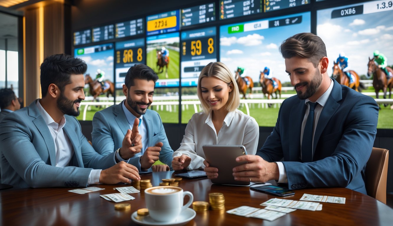 Orang-orang di ruang taruhan balap kuda modern sedang menganalisis pilihan taruhan dengan layar digital dan latar belakang lintasan balap kuda.