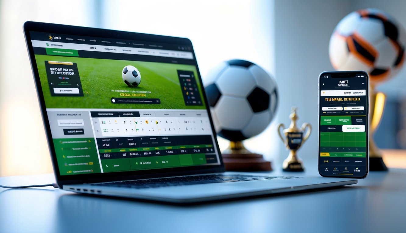 Seorang pria menggunakan laptop dan ponsel untuk memasang taruhan sepak bola online di meja kerja yang rapi dengan bola sepak dan piala kecil di latar belakang.